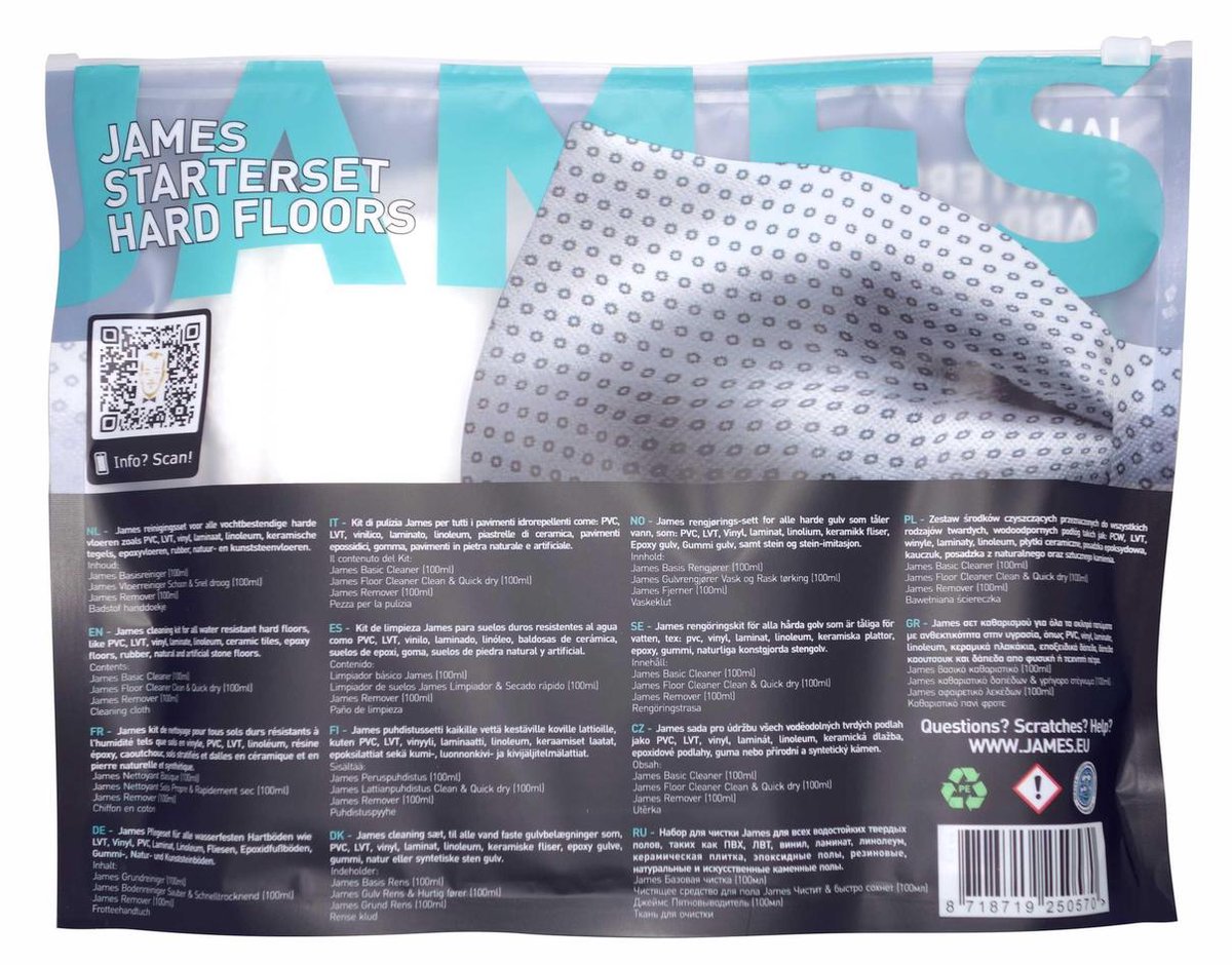 De James Starterset biedt gebruiksgemak dankzij duidelijke instructies en hoogwaardige producten. De set helpt niet alleen bij het verbeteren van de uitstraling van uw vloer maar verlengt ook de levensduur ervan. Het gebruik van de James Starterset zorgt voor een grondige reiniging zonder de vloer te beschadigen.