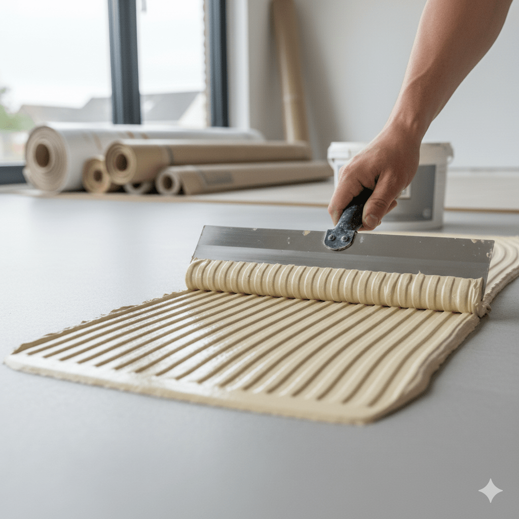 1. Breng de professionele PVC vloerlijm met de juiste vertande lijmkam gelijkmatig aan